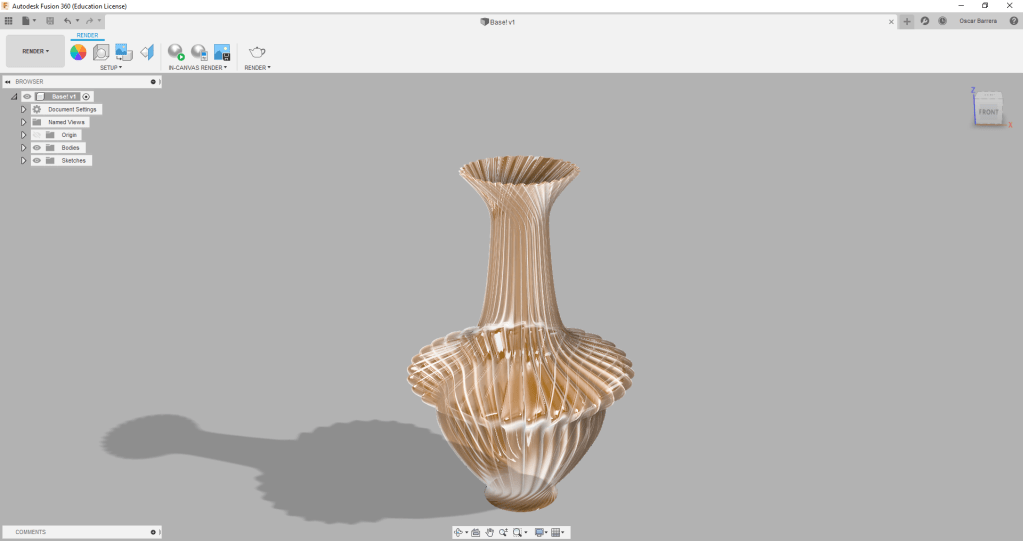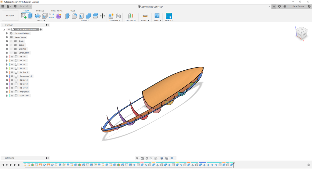 After a couple of weeks learning different tools in Fusion, this simple looking canoe has been more than a challenge to make, with multiple sections and separated components to make a whole body, when they are all together! This way multiple pieces can be put together to form enormous objects.