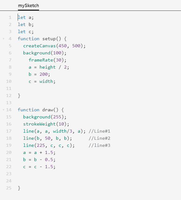 The code for this week! The challenge was to make moving lines, which I sort of did… but they are a little different as they change in size and location, I like to work on coding as each challenge gets harder and harder.