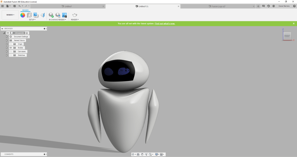 The recreation of the Fusion 360 logo has been completed! This time I learned about bunch of new tools! Creating faces from a 2d Plane and then turning them into 3d planes made it really fun, this was a long process that required many steps, from creating a face to rendering an entire body.